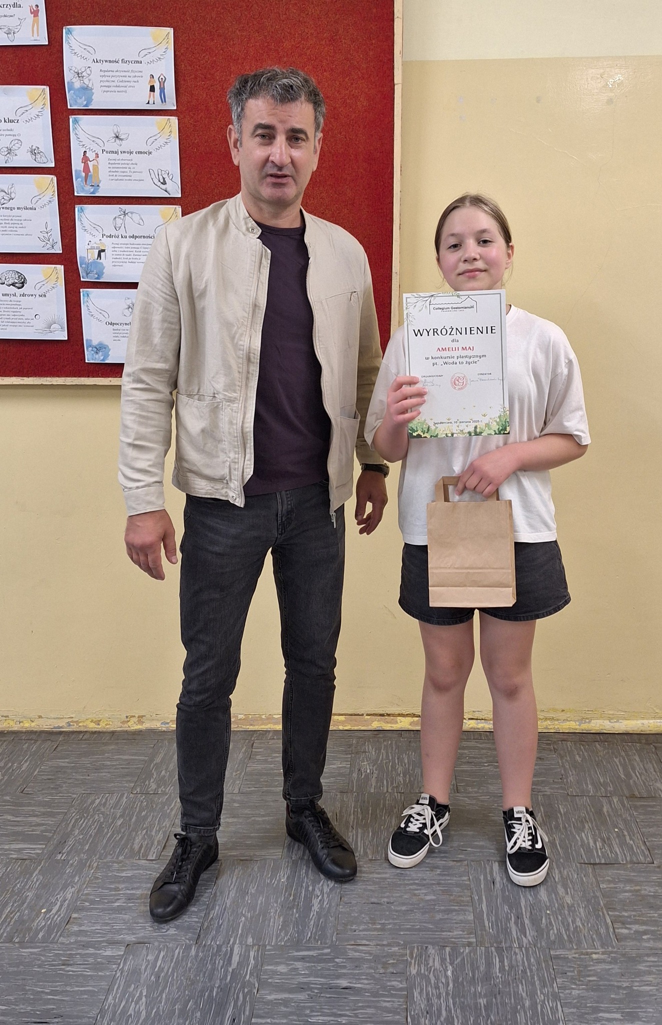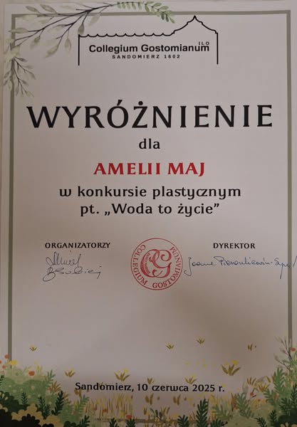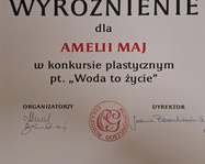 Wyróżnienie dla Amelii Maj z klasy piątej w konkursie plastycznym "Woda to życie", którego organizatorem było Collegium Gostomianum.