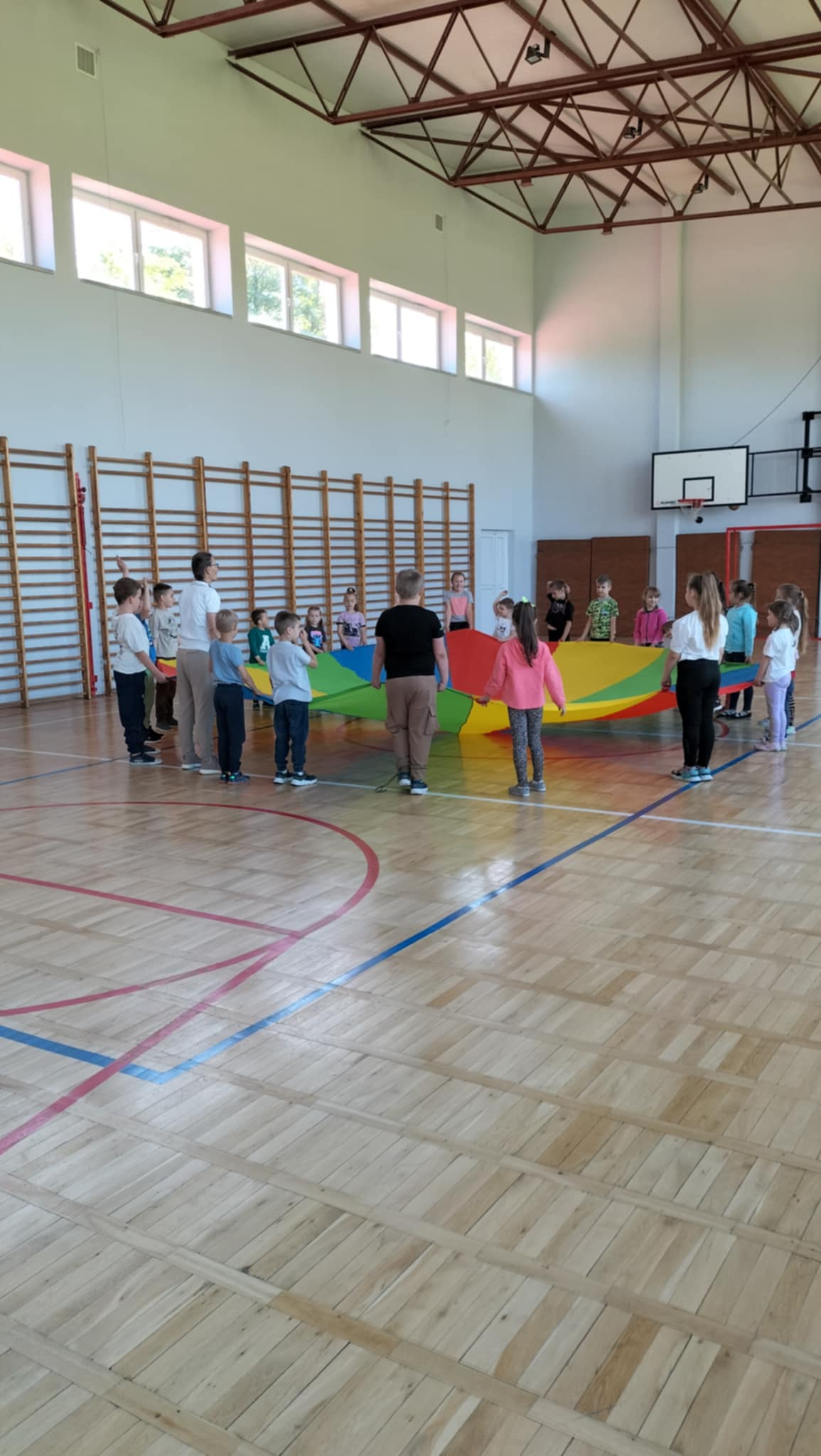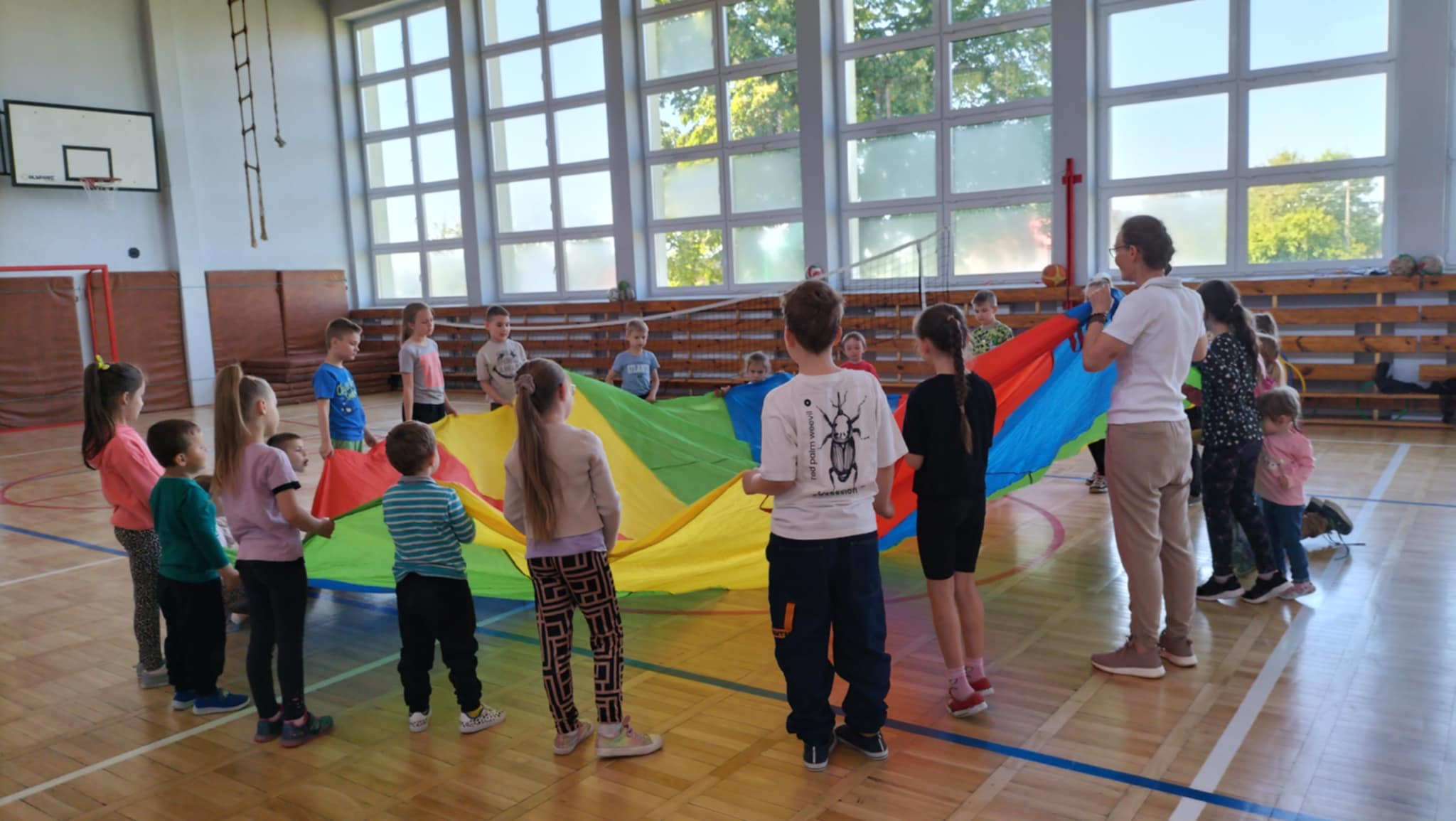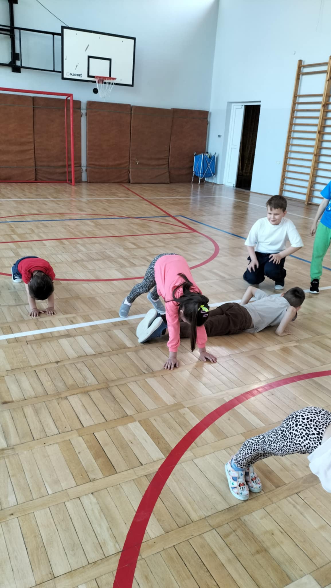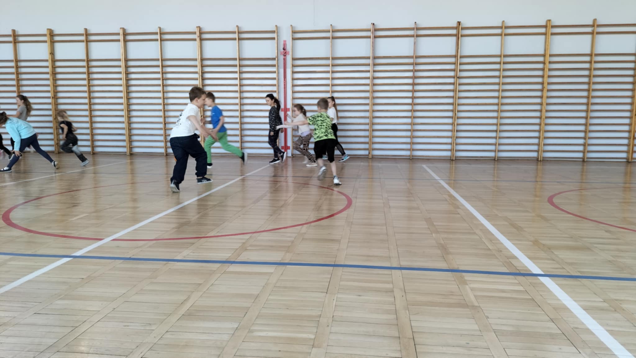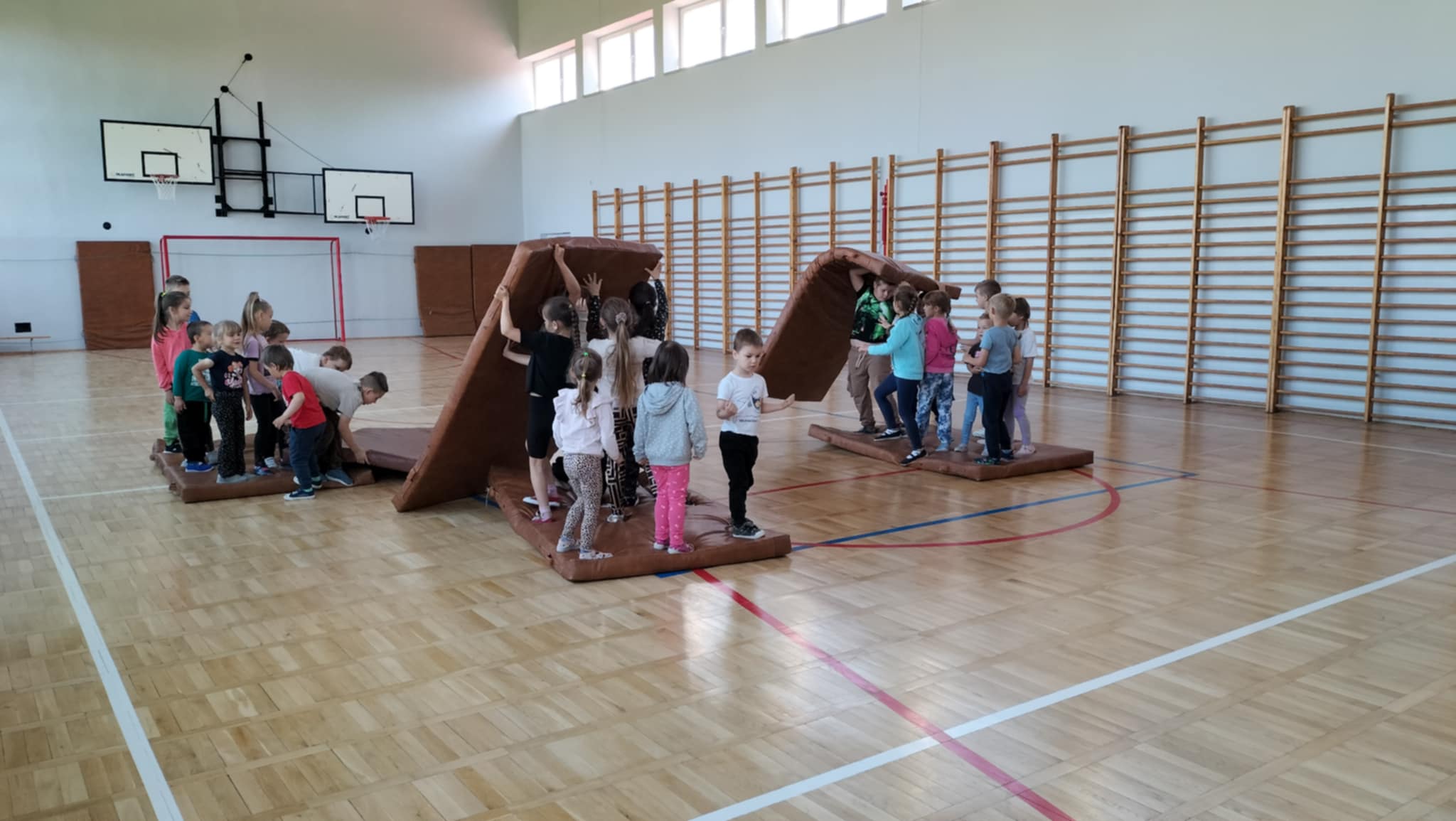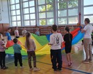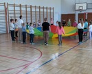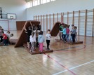 Wspólna zabawa zaczęła się na sali gimnastycznej podczas gier i zabaw sportowych.