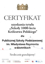 Dzięki zaangażowaniu naszych uczniów i nauczycieli w realizację zadań w projekcie Muzeum Historii Polski, Polskiego Towarzystwa Historycznego i Instytutu Archiwistyki Uniwersytetu Mikołaja Kopernika w Toruniu "1000 lecie Królestwa Polskiego" nasza szkoła otrzymała tytuł "Szkoły 1000-lecia Królestwa Polskiego".