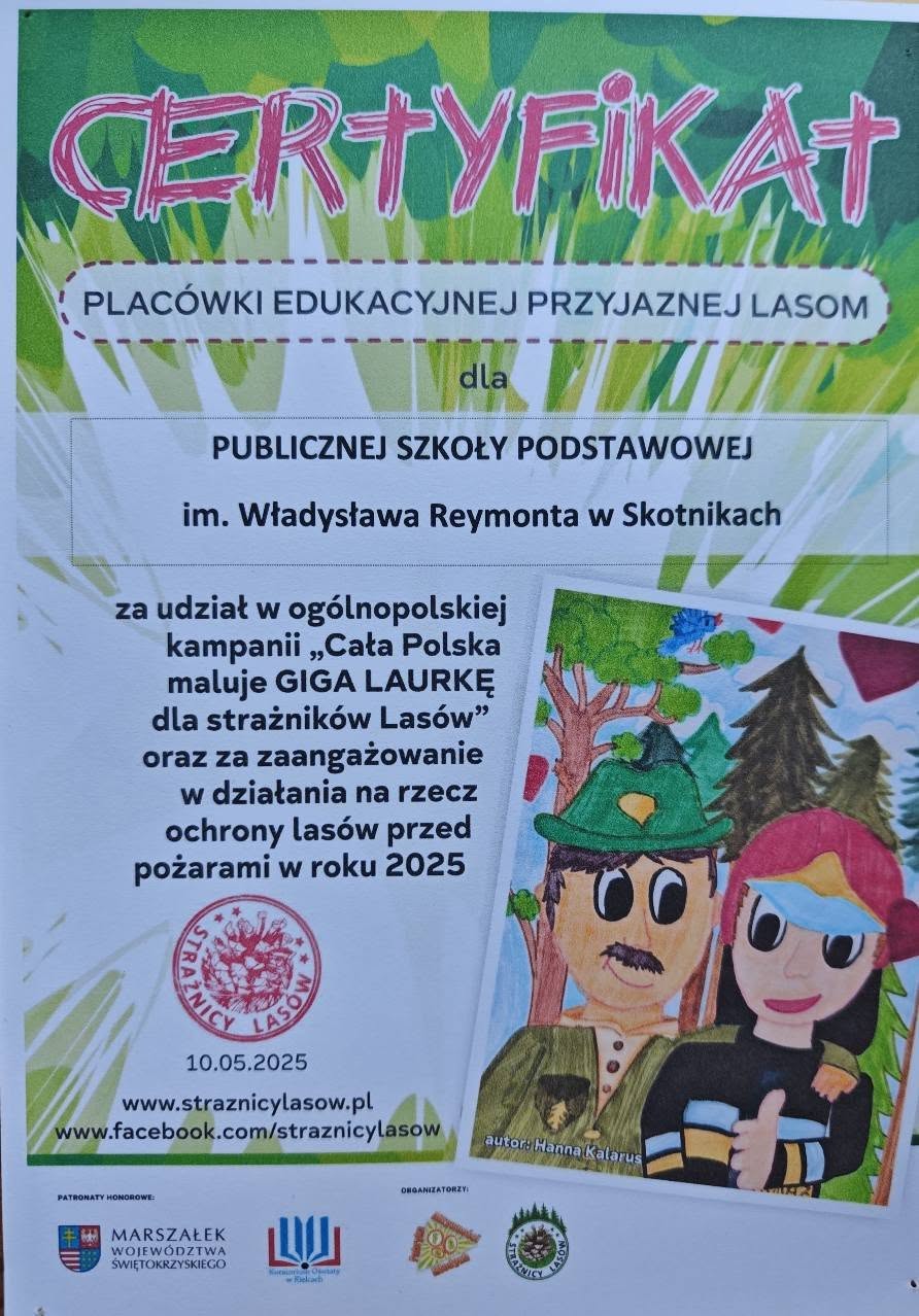 Z dumą informujemy, że nasza szkoła otrzymała Certyfikat Placówki Przyjaznej Lasom, a każdy uczestnik Dyplom Małego Strażnika Lasów.